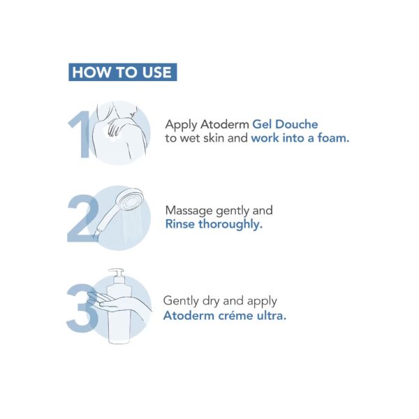 - Apply the Bioderma Atoderm Gel Douche on the wet skin.