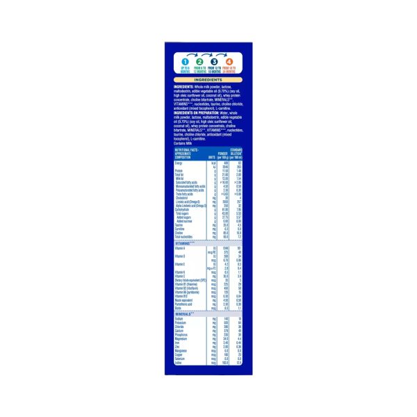 Whole milk powder, lactose, maltodextrin, edible vegetable oil (soy oil, high oleic sunflower oil, coconut oil), whey protein concentrate,vitamins,minerals,taurine, potassium citrate (acidity regulator), L-carnitine, antioxidant (mixed tocopherols).