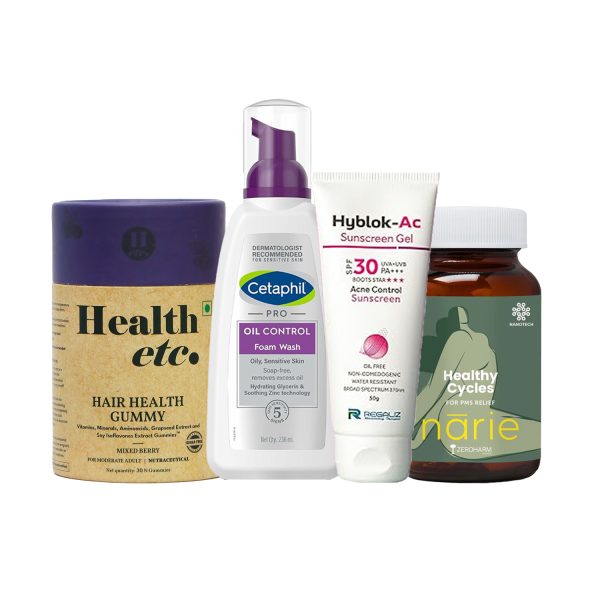 PCOS , Acne and Hair Wellness Routine (Health etc Hair Health Gummy 30nos + Cetaphil PRO Oil Control Foam Face Wash for Acne & Oily Prone Skin 263ml + Regaliz Hyblok-AC Sunscreen Gel 50gm + Zeroharm Narie Healthy Cycles 60 Tablets)