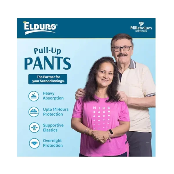 Eldura premium pull up pant diaper is breathable cottony-soft material fabrics for long lasting freshness and advanced leak protection for standing leak protection.