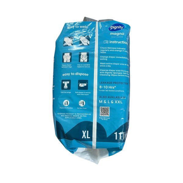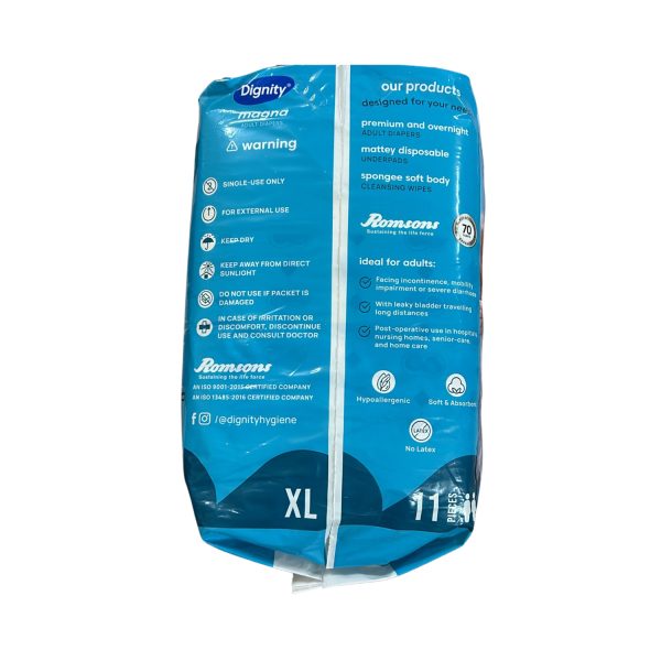 Dignity Magna Adult Diaper is specifically designed to ensure leakage free for upto 8-10 hours and helps keep the user dry and clean.
