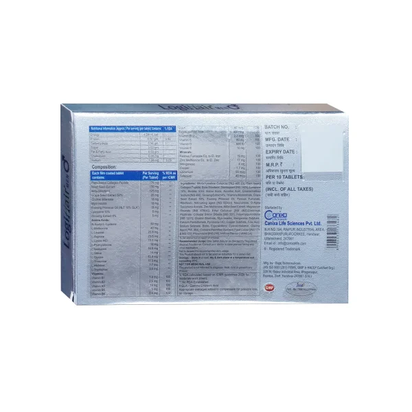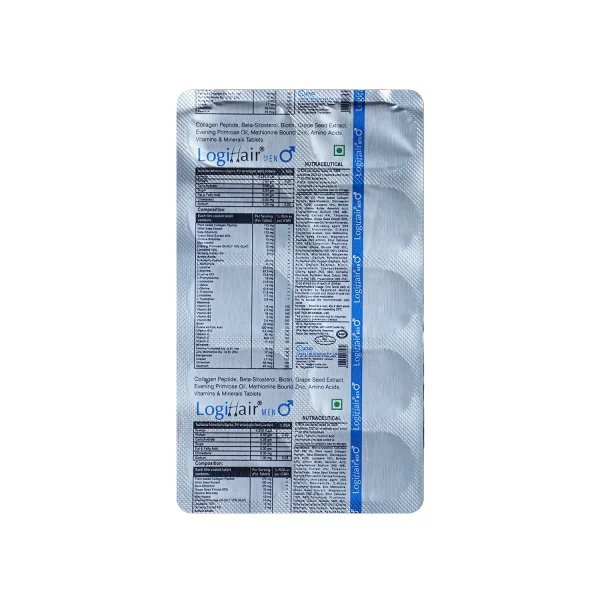 LogiHair Men Tablet is a dietary supplement formulated with collagen peptide, beta-sitosterol, biotin, grape seed extract, green tea extract, methionine-bound zinc, amino acids, and other essential vitamins and minerals that support hair health in men.