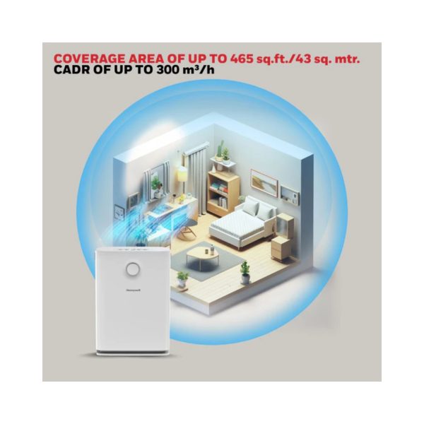 Honeywell Air Touch V3 offers a CADR (Clean Air Delivery Rate) of up to 300 m³/h and is designed to cover areas of up to approximately 465 sq. ft (43 m²). Its advanced 5-stage filtration system and ability to deliver up to 5 air changes per hour enable it to clean the air in larger spaces more effectively compared to many smaller purifiers