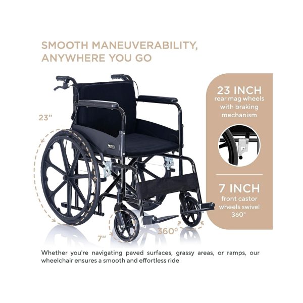 - Equipped with 23” mag rear wheels, this wheelchair offers enhanced stability and a smooth ride. The mag wheels provide excellent traction on various surfaces, ensuring a comfortable and reliable mobility experience. 7” Front castor wheels swivel 360°, allowing you to navigate and clear obstacles effortlessly.