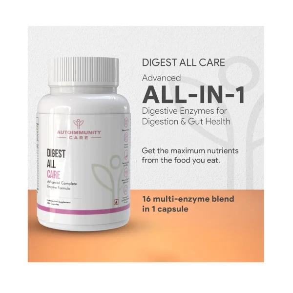 - Digest all care contains a blend of 16 enzymes which supports digestion and aids with stomach discomfort.