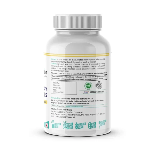 FM nutrition happy bowel capsule improves the bowel movement, offers relief from constipation, GERD, bloating, and SIBO, and improves gut health.