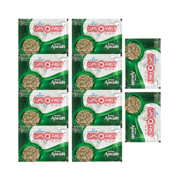 Gas-o-fast sachets contain a combination of Jeera and Ajwain that helps to reduce gas, bloating, and other symptoms of indigestion. The ingredients help to neutralize acidity in the stomach, stimulate digestion, and reduce gas.