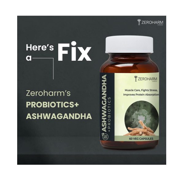 - Zeroharm Sciences Ashwagandha Probiotics capsule is loaded with the benefits of Ashwagandha, plant-based prebiotics, and spore-based probiotics.