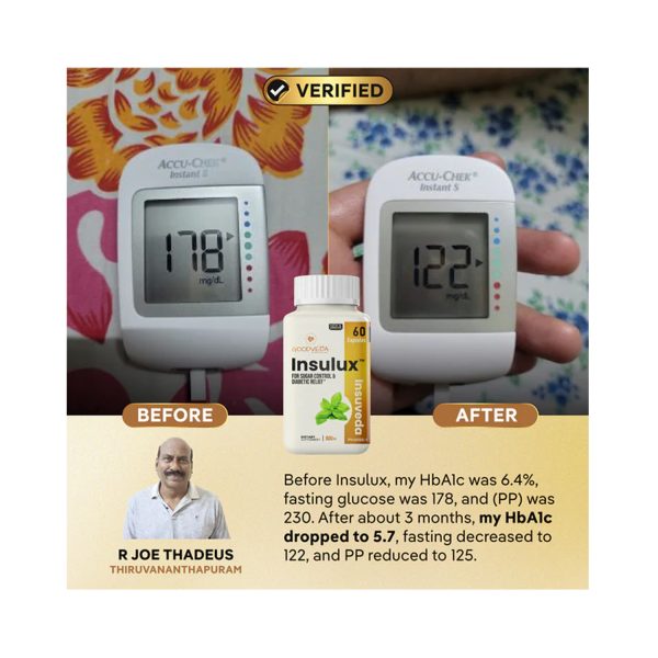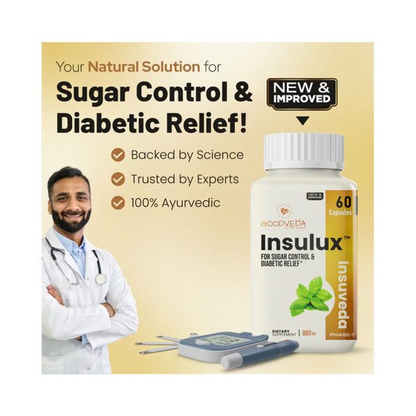 Insulux capsules help maintain sugar control, improve sugar metabolism, insulin production, and antioxidant activity, eliminates insulin resistance, and revitalizes energy and mood.