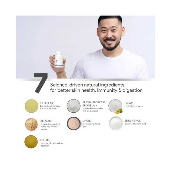 • Pepsin, Protease, Bromelain, Cellulase, Lipase, Amylase and Betaine HCL increases stomach acid and assists with promoting digestion.