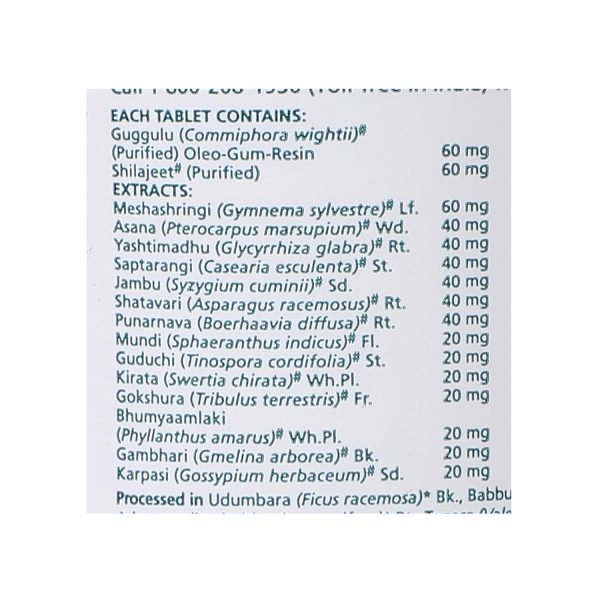 - Guggulu, Shilajit, Meshashringi, Asana, Yashtimadhu, Saptarangi, Jambu, Shatavari, Punarnava, Mundi, Guduchi, Kirata, Gukshura, Bhumyamalaki, Gambhari, Karpasi and Purified gum resin