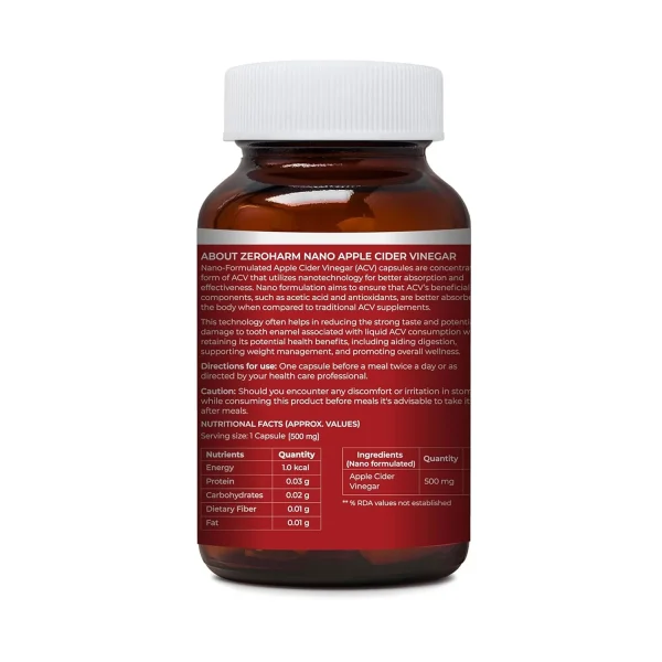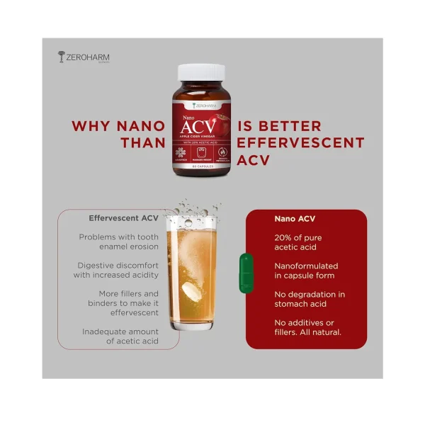 Each Zeroharm Nano ACV capsule contains approximately 20% acetic acid, which is the active ingredient believed to provide the health benefits associated with apple cider vinegar.