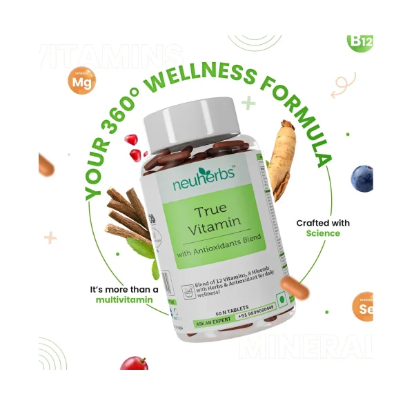Neuherbs true vitamin tablet helps manage oxidative stress, enhances immunity, and prevents free radical damage in the body tissues.