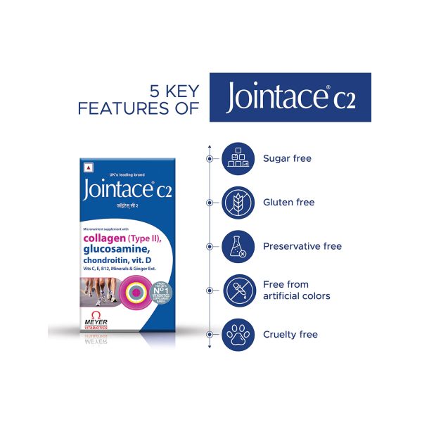 Jointace C2 Tablet is used as a supplement for patients with osteoarthritis to ease the symptoms. Glucosamine, Collagen, and Chondroitin sulphate prevent the degeneration of joint cartilage and also decrease pain. It is also packed with other vitamins and minerals that boost the immune system, prevent cell damage, and reduce the inflammation of the joints.
