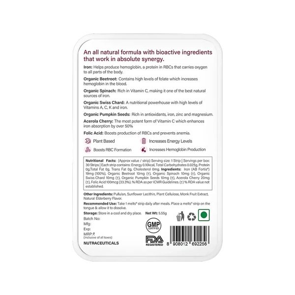 Melts Nano Iron is easy to consume, non-nauseating, non-constipating and gentle on the stomach, unlike other iron supplements. It is formulated with 100% Plant-Based and iron-rich foods like pumpkin seeds, swiss chard, spinach, beetroot. These tasty and super effective thin oral strips are gentle on the stomach and do not cause any nausea, which makes them ideal and fit for daily consumption.