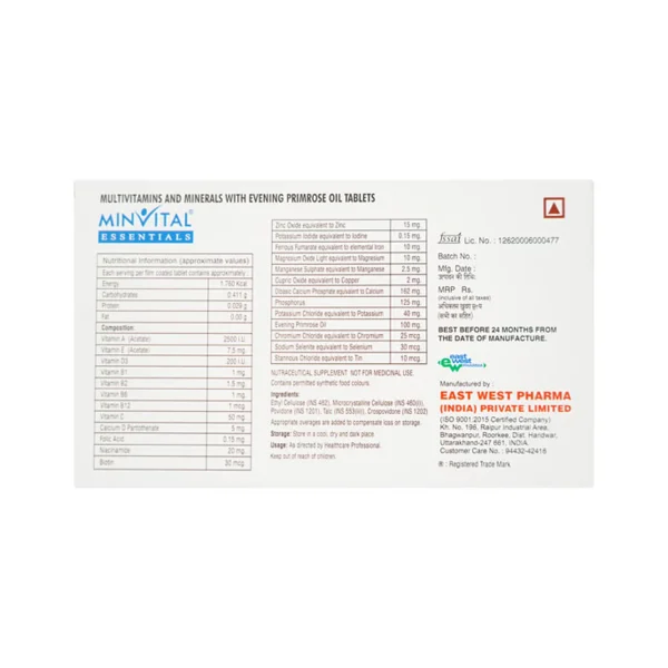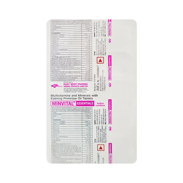 - Minvital essentials tablets contain evening primrose oil, multivitamin and multiminerals.