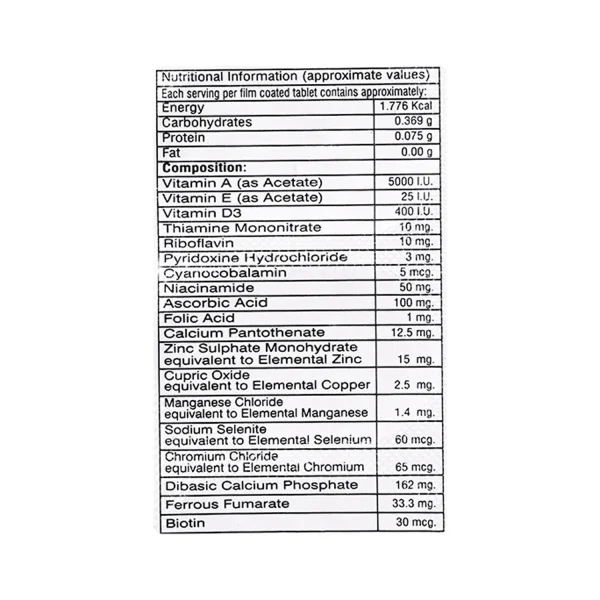- Vitamin A I.P 5000 I.U, Vitamin E I.P 25 I.U, Vitamin D3 I.P 400 I.U, Thiamine Mononitrate I.P 10mg, Riboflavine I.P 10mg, Pyridoxine Hcl I.P 3mg, Cyanocobalamin I.P 5mcg, Niacinamide I.P 50mg, Ascorbic Acid I.P 100mg, Folic Acid I.P 1mg, Calcium Pantothenate I.P 12.5mg, Zinc Sulphate I.P 15mg, Cupric Oxide B.P 2.5mg, Manganese Chloride U.S.P 1.4mg, Sodium Selenate B.P 60mcg, Chromium Chloride U.S.P 65mcg, Calcium Diabasic Phosphate I.P 162mg, Dried Ferrous Fumerate 33.3mg, Biotin 30mcg