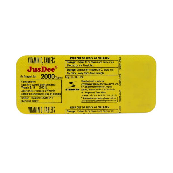 - Jusdee 2000 tablet is formulated with Vitamin D3 which is essential for bone and teeth health.