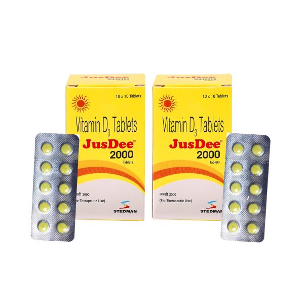 Jusdee 2000 tablet is ideal to tackle vitamin D3 and calcium deficiency; recommended for osteopenia, arthritis, osteoarthritis, fractures, also can be used as a dietary supplement to improve calcium absorption.