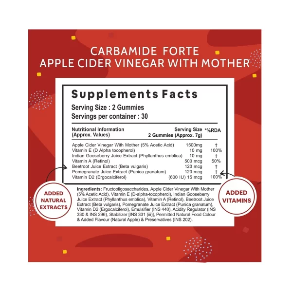 Yes, Carbamide Forte apple cider vinegar gummies are formulated with organic apple cider vinegar with mother and extracts from pomegranate, amla and beetroot. They are also free from gluten, preservatives and artificial ingredients.