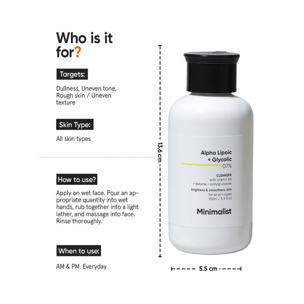 Minimalist 7% ALA & AHA Brightening Face Wash is an everyday face wash for skin brightening with 7% alpha lipoic acid and glycolic acid (AHA) that boost skin turnover and exfoliation to provide radiant and even toned skin.