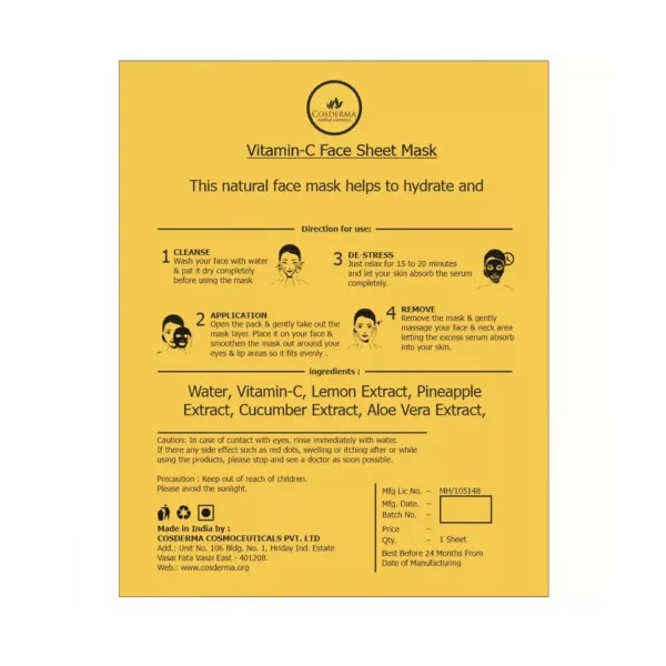 - Cosderma vitamin C face sheet mask offers deep nourishment and restores skin radiance.