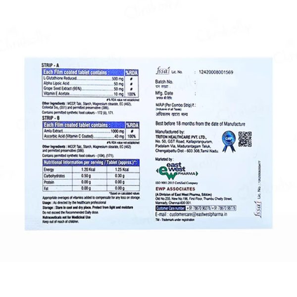 Strip A: L-Glutathione 500 mg, Grape Seed Extract 50 mg, Alpha Lipoic Acid 50 mg, Vitamin C 50 mg, Vitamin E 50 IU