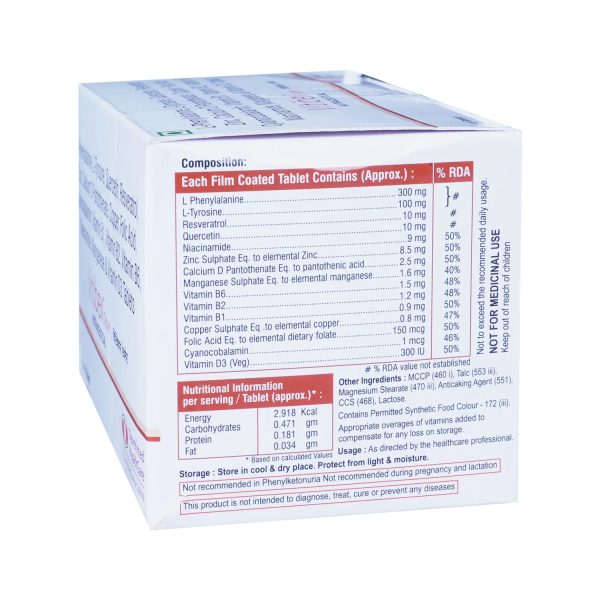 - L-Phenylalanine, L Tyrosine, Quercetin, Resveratrol, Zinc, Calcium Pantothenate, Copper, Folic Acid and Cyanocobalamin