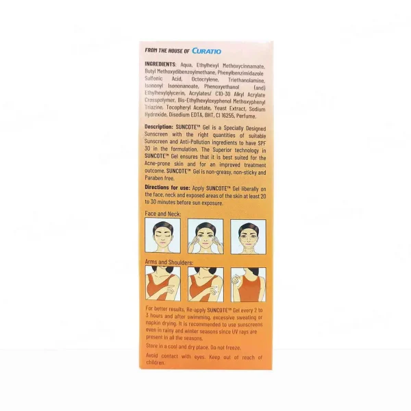 Suncote Gel is a water-based sunscreen that protects the skin against UVA and UVB rays by providing a physical and chemical barrier to sunlight, protects your skin from harmful rays; a gel-based sunscreen that is non-comedogenic with a high SPF value of 30.
