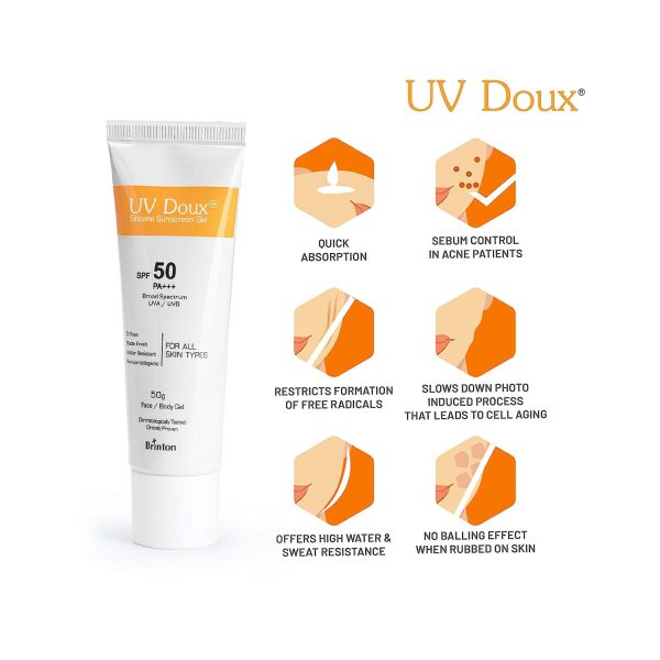 UV Doux Sunscreen SPF50+ Gel provides a broad spectrum protection against UVA and UVB, provides a matte finish and inhibits formation of radicals and helps in sebum control in acne prone patients.