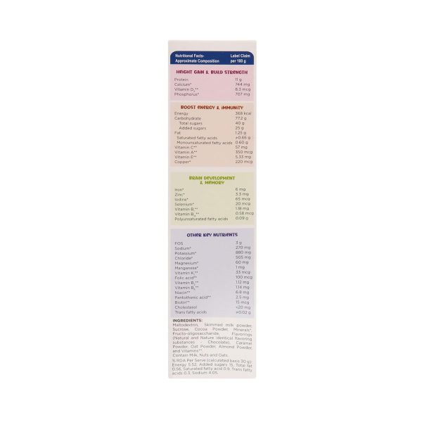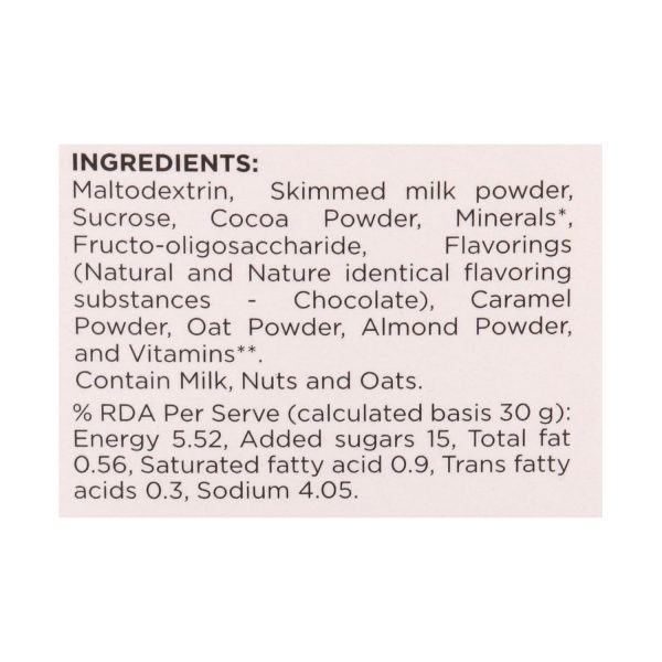 - Maltodextrin, Skimmed milk powder, Sucrose, Minerals, Fructo-oligosaccharide, Flavorings (Nature identical favoring substances-Vanilla), Oat Powder, Almond Powder, Vitamins”, %RDA Per Serve (calculated basis 30 g: Energy 5.51, Added sugars 72, Total fat 0.39, Saturated fatty acid 068, Trans fatty acids 0.3, Sodium 4.05)