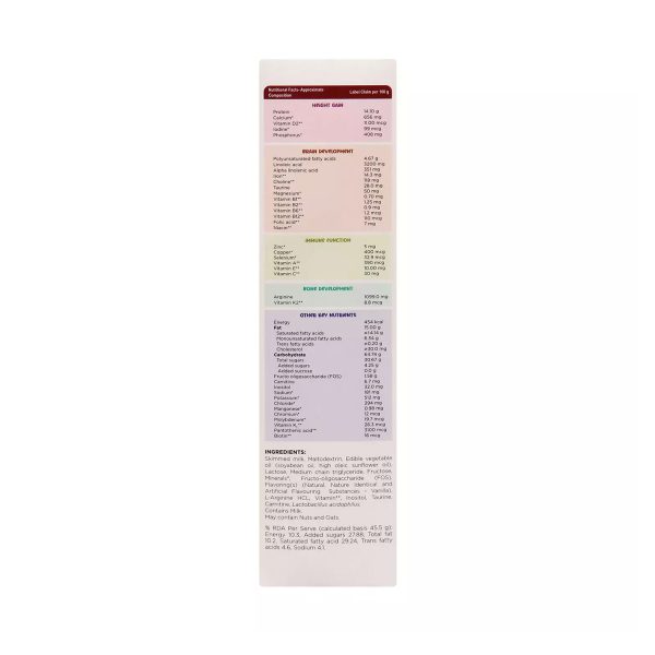 - Height Gain (Protein 14.10 g, Calcium 656 mg, Vitamin D, 11 mcg, lodine 3200 mg, Alpha linoleic acid 351 mg, Iron 14.3 mg, Choline 118 mg, Taurine)