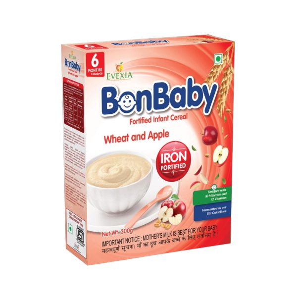 Evexia bonbaby wheat apple cereal is easy to prepare baby food, helps improve babies' growth and development by providing a balanced nutrition and energy.