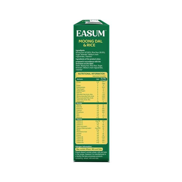 - Moong Flour (47.86%), Rice Flour (36.9%), Sugar, Minerals#, Medium Chain Triglycerides, Vitamins