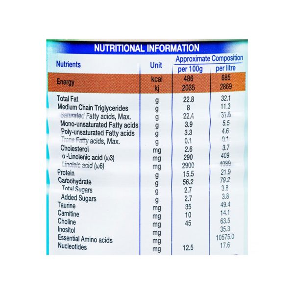 - Maltodextrin, Edible Vegetable Oils (Coconut Oil, Canola Oil & Corn Oil), Medium Chain Triglycerides, Minerals, Acidity Regulator (Sodium Hydroxide), Vitamins, Taurine, Nucleotides Premix, L-Carnitine, Antioxidant (Mixed Tocopherols)